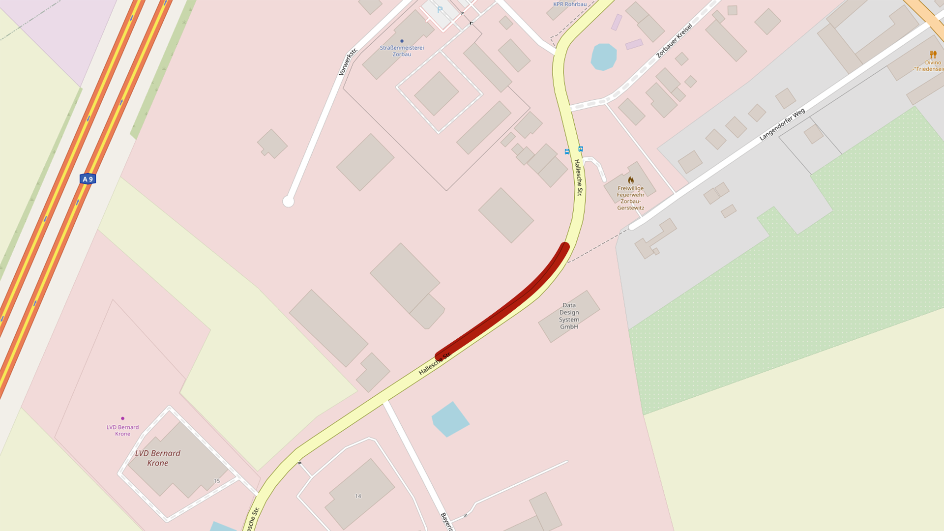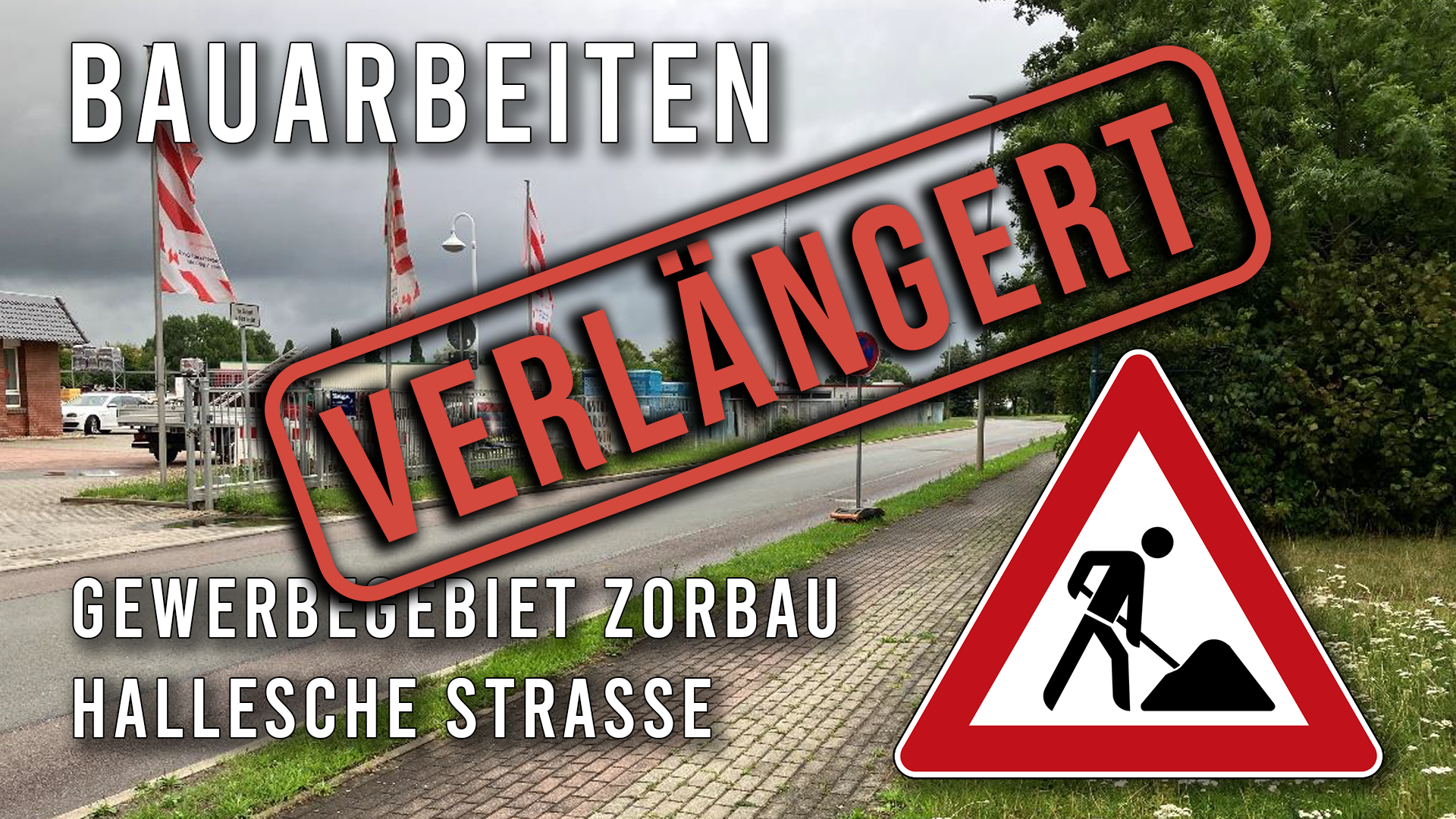 Aufgrund von Bauverzögerungen muss die Baumaßnahme im Gewerbegebiet Zorbau im Bereich Hallesche Straße 9-11 bis zum 29. August 2025 verlängert werden.