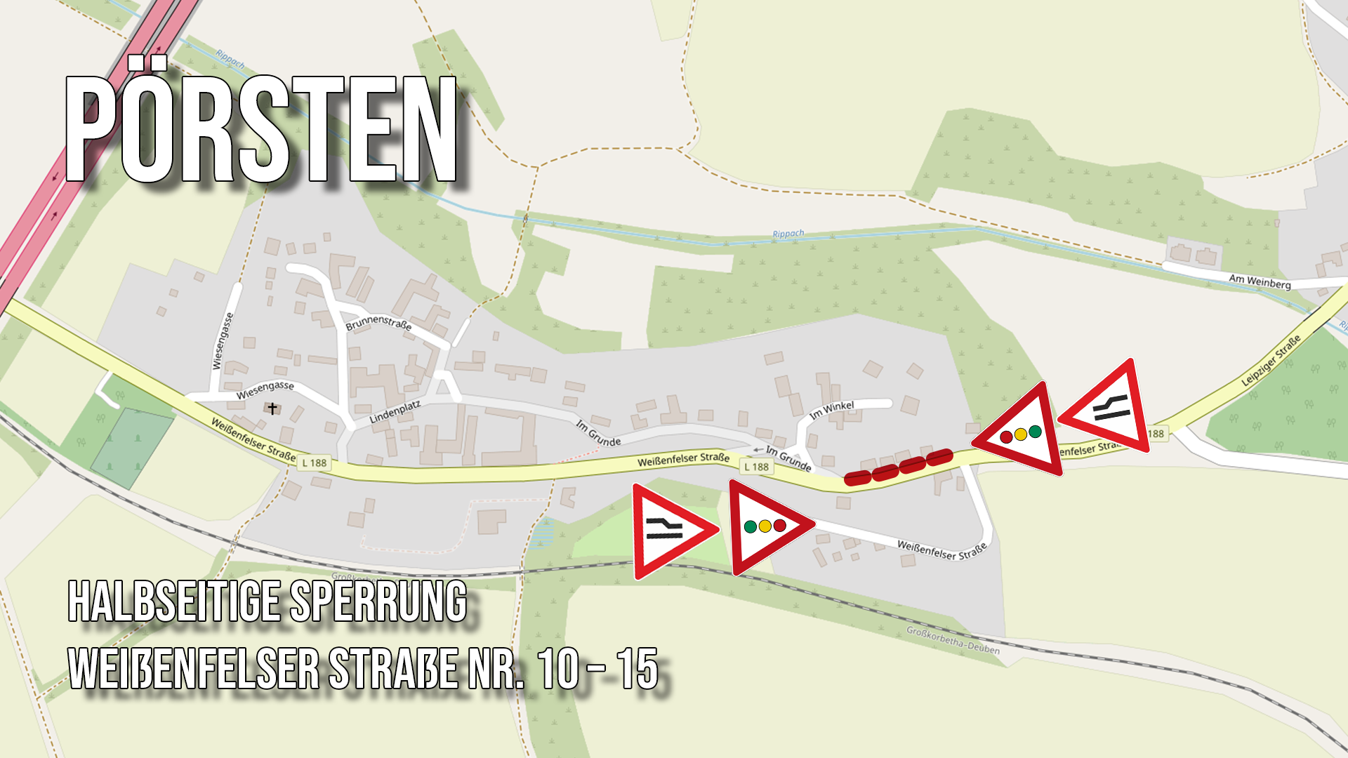 In der Zeit vom 06.10.2025 bis voraussichtlich 17.10.2025 kommt es in der Pörsten in der Weißenfelser Straße Nr. 10 - 15 zu einer halbseitigen Sperrung der Landstraße.