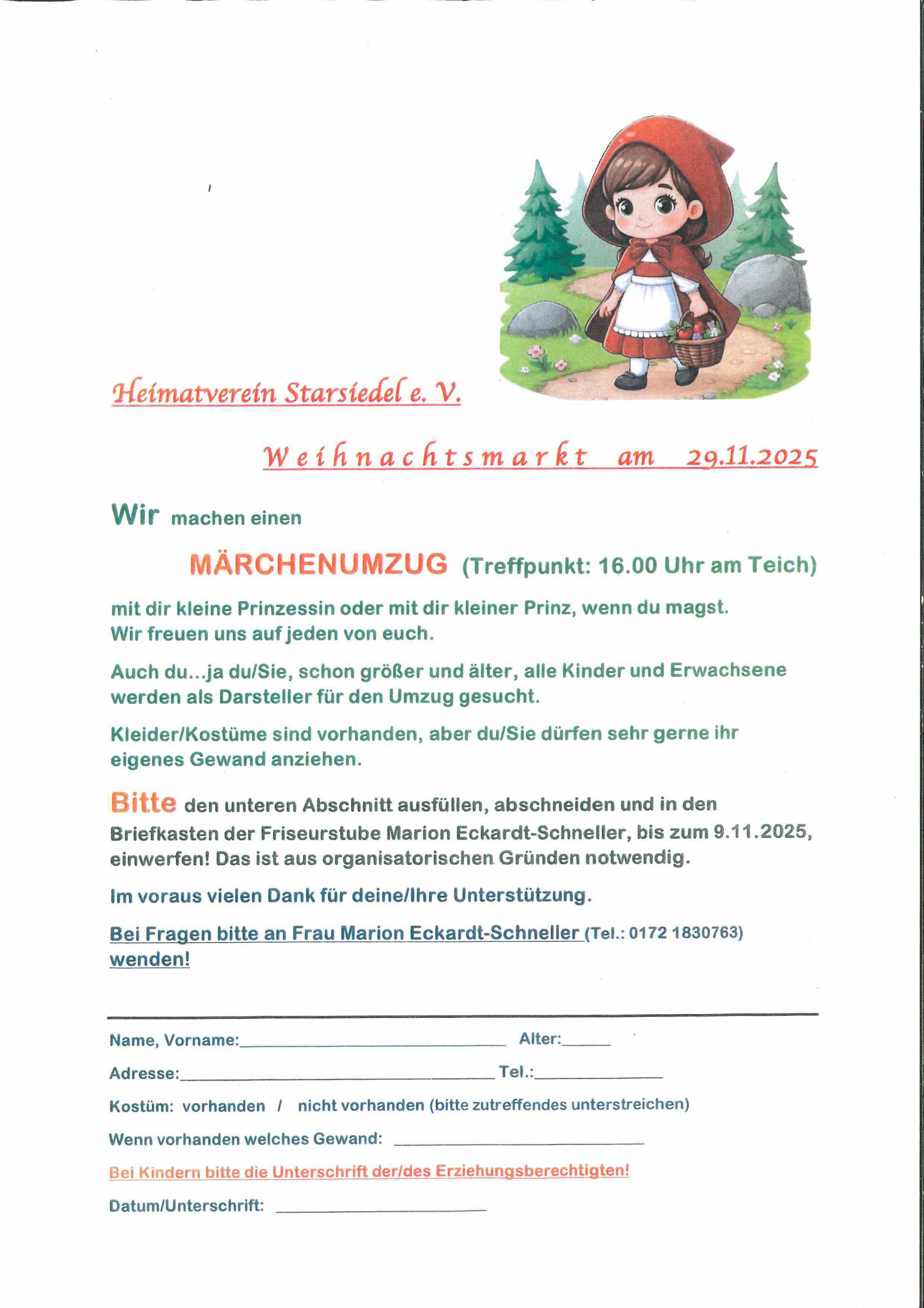Wer Teil des wandelnden Märchenwaldes sein möchte, der soll bitte den unteren Abschnitt der beigefügten PDF ausfüllen und in den Briefkasten der Friseurstube Marion Eckardt-Schneller in Starsiedel einwerfen.