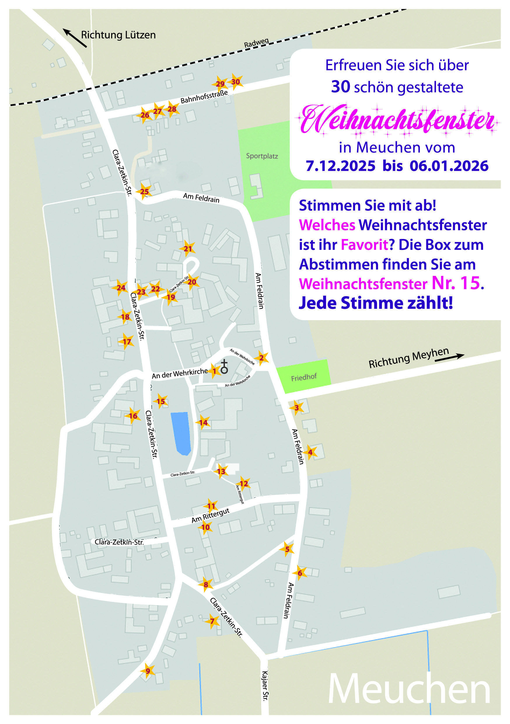Bis zum 6. Januar dürfen die Bewohner und Gäste des Ortes abstimmen, welches Fenster ihnen am besten gefallen hat. Stimmzettel und Stimmbox befinden sich mitten im Ort am Dorfgemeinschaftshaus.