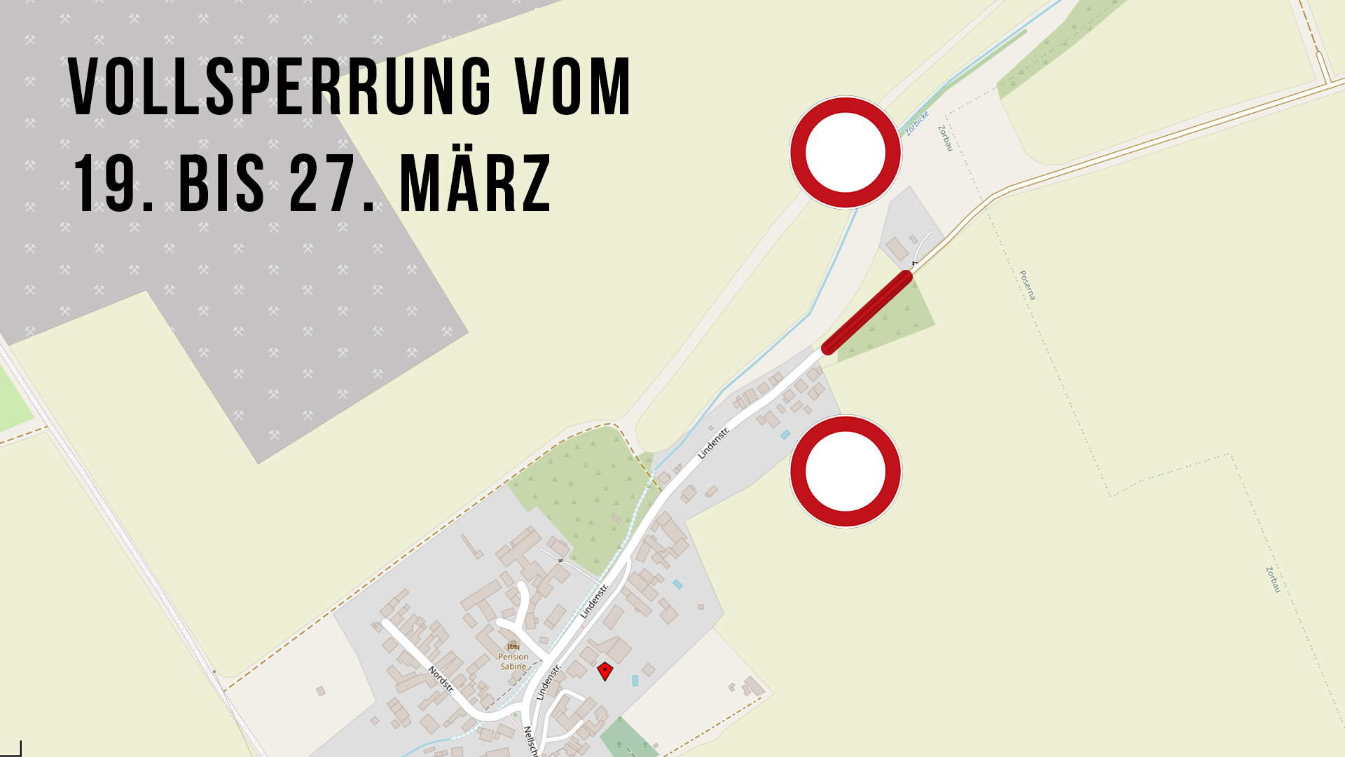 Im Zeitraum vom 19.03. bis 27.03.2026 ist aufgrund der Herstellung einer Stromtrasse die Straße Nellschütz auf Höhe der Hausnummer 28 in 06686 Lützen OT Nellschütz, entsprechend der beigefügten Karte, voll gesperrt.