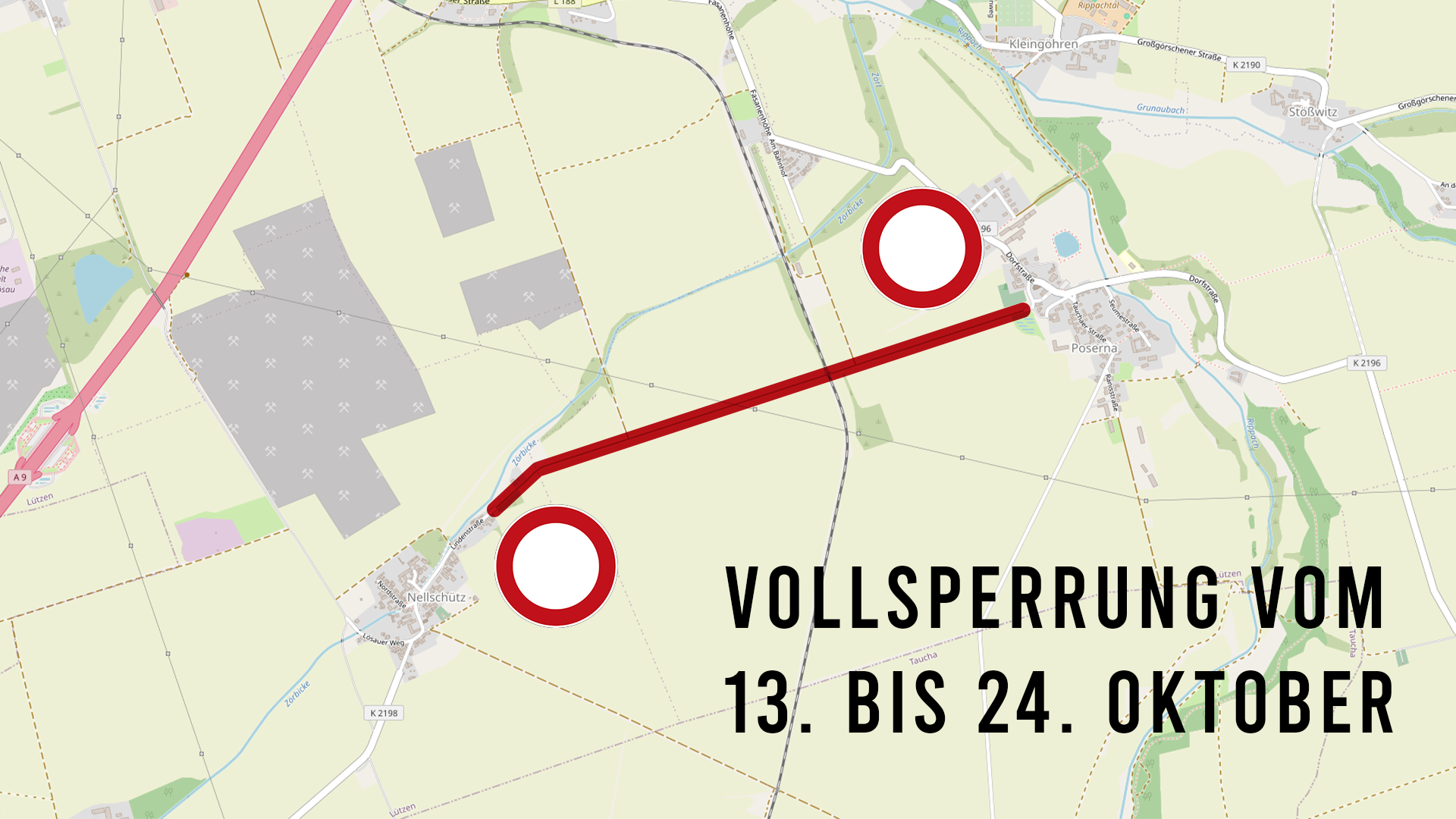 In der Zeit von 13.10.2025 bis voraussichtlich 24.10.2025 ist der Ortsverbindungsweg zwischen Nellschütz und Poserna gesperrt.