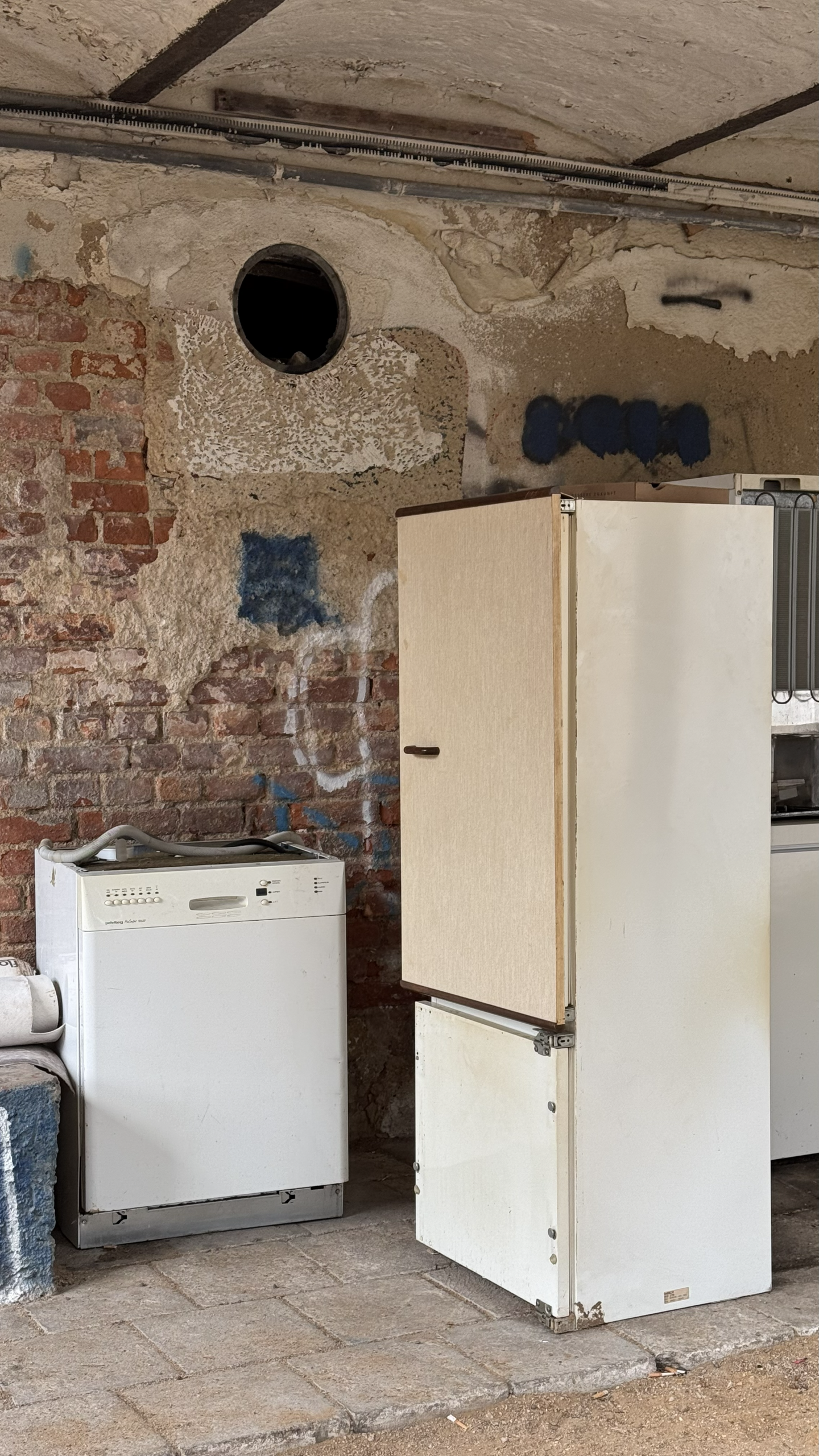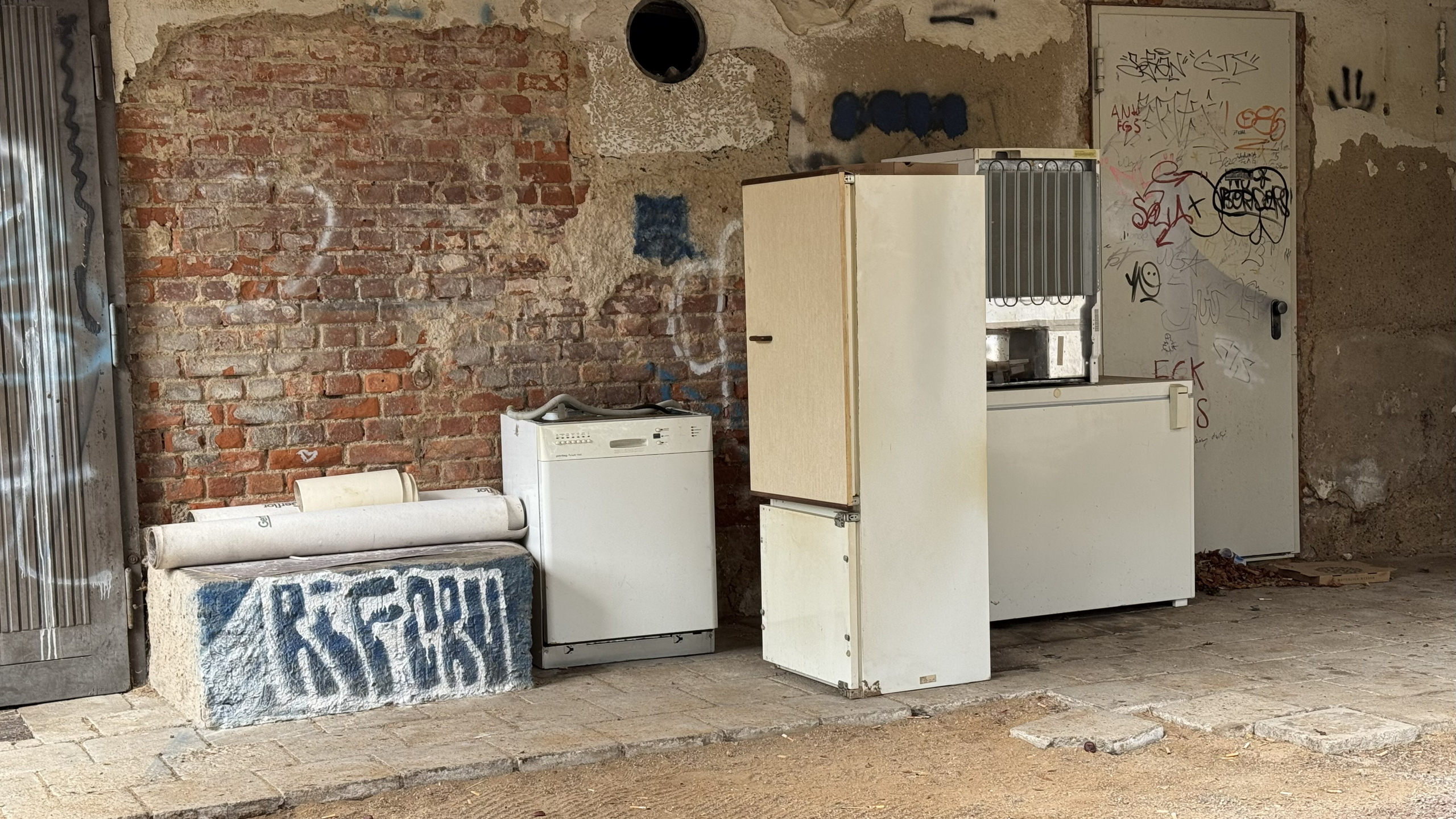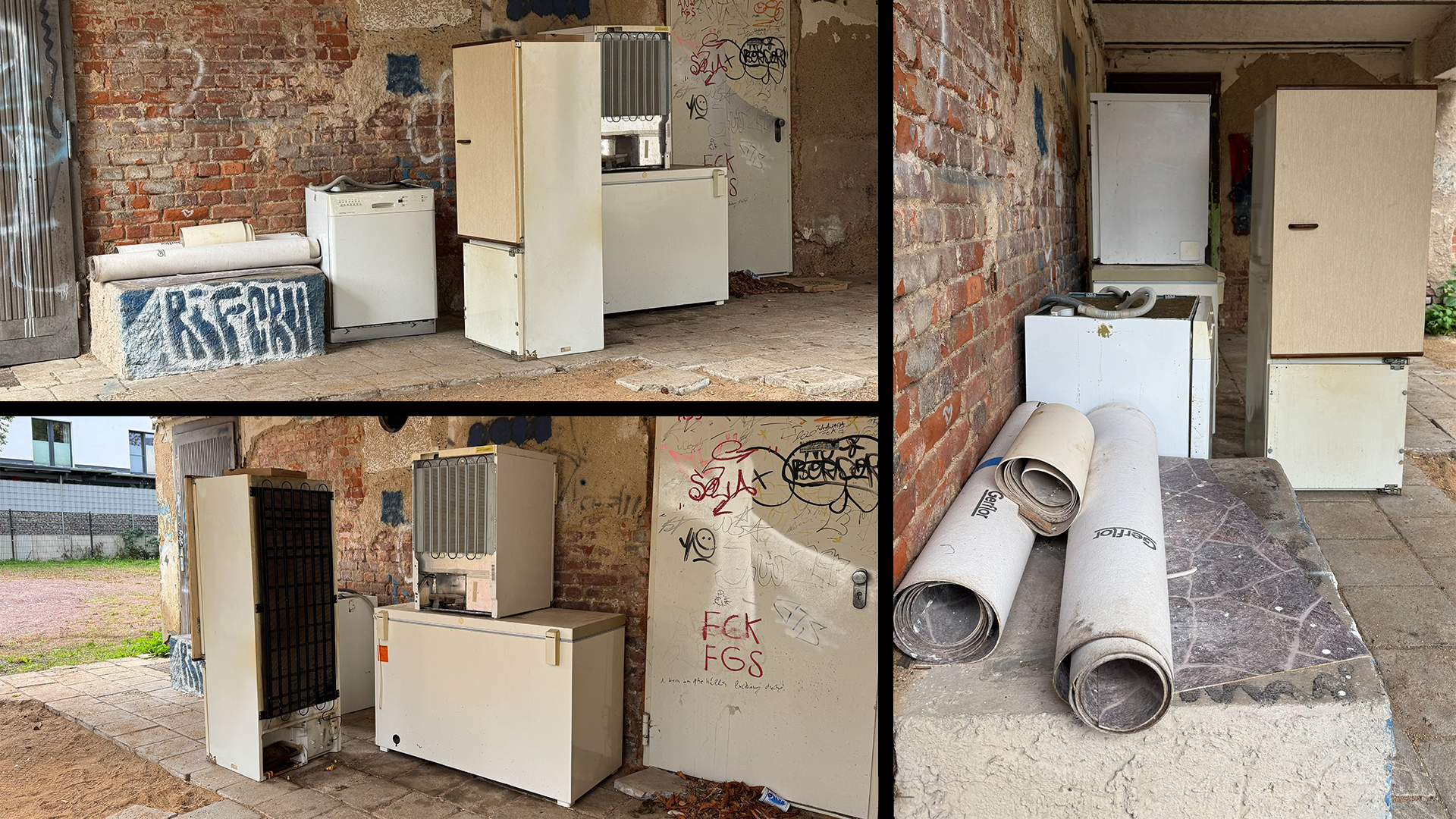 Da staunten Mitarbeiter des Bauhofes nicht schlecht, als sie am Roten Löwen in Lützen Mäharbeiten vornahmen. Unter einem Vorsprung am Roten Löwen stehen allerlei große Haushaltsgegenstände: zwei Kühlschränke, eine Tiefkühltruhe und eine Geschirrspülmaschine. Dazu gesellen sich Bodenbeläge.