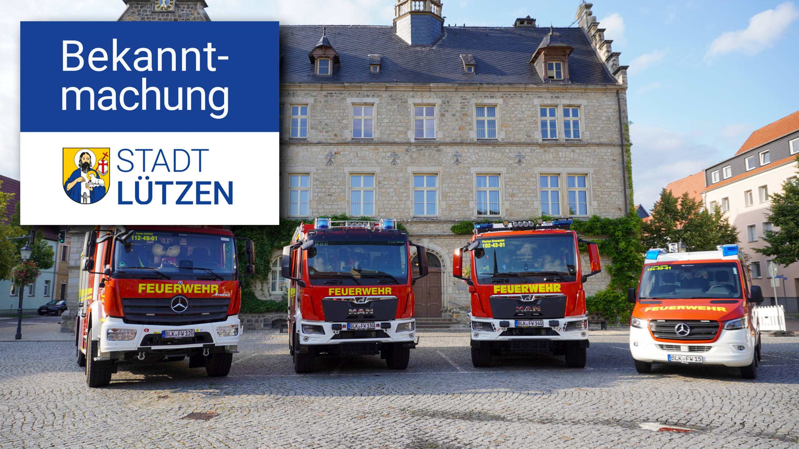 Soweit Bewerber zum Zeitpunkt der Wahl noch nicht über o. g. Qualifikationen verfügen, ist diese binnen eines Jahres nachzuweisen. Die Stadt Lützen behält sich in diesem Fall vor, den Gewählten befristet mit der Wahrnehmung der Aufgaben zu beauftragen. Die Bewerbung um das Amt des Ortswehrleiters und des stellvertretenden Ortswehrleiters ist unter Angabe der Funktion und dem Namen der Ortsfeuerwehr formlos schriftlich zu richten bis zum 02.01.2026, 11.00 Uhr an: