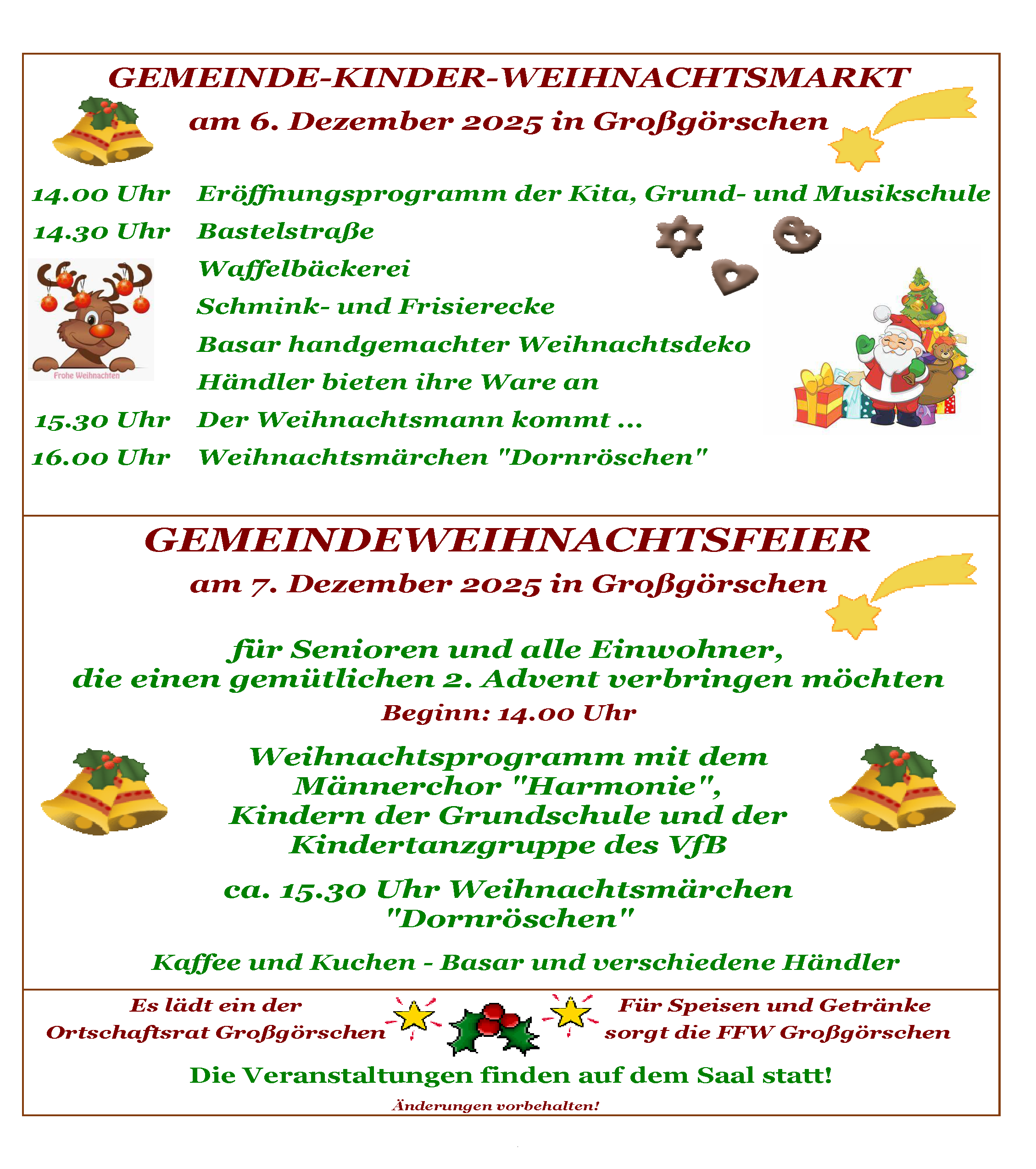 Am 7. Dezember findet die Gemeindeweihnachtsfeier in Großgröschen von 14:00 bis ca. 19:00 Uhr statt.