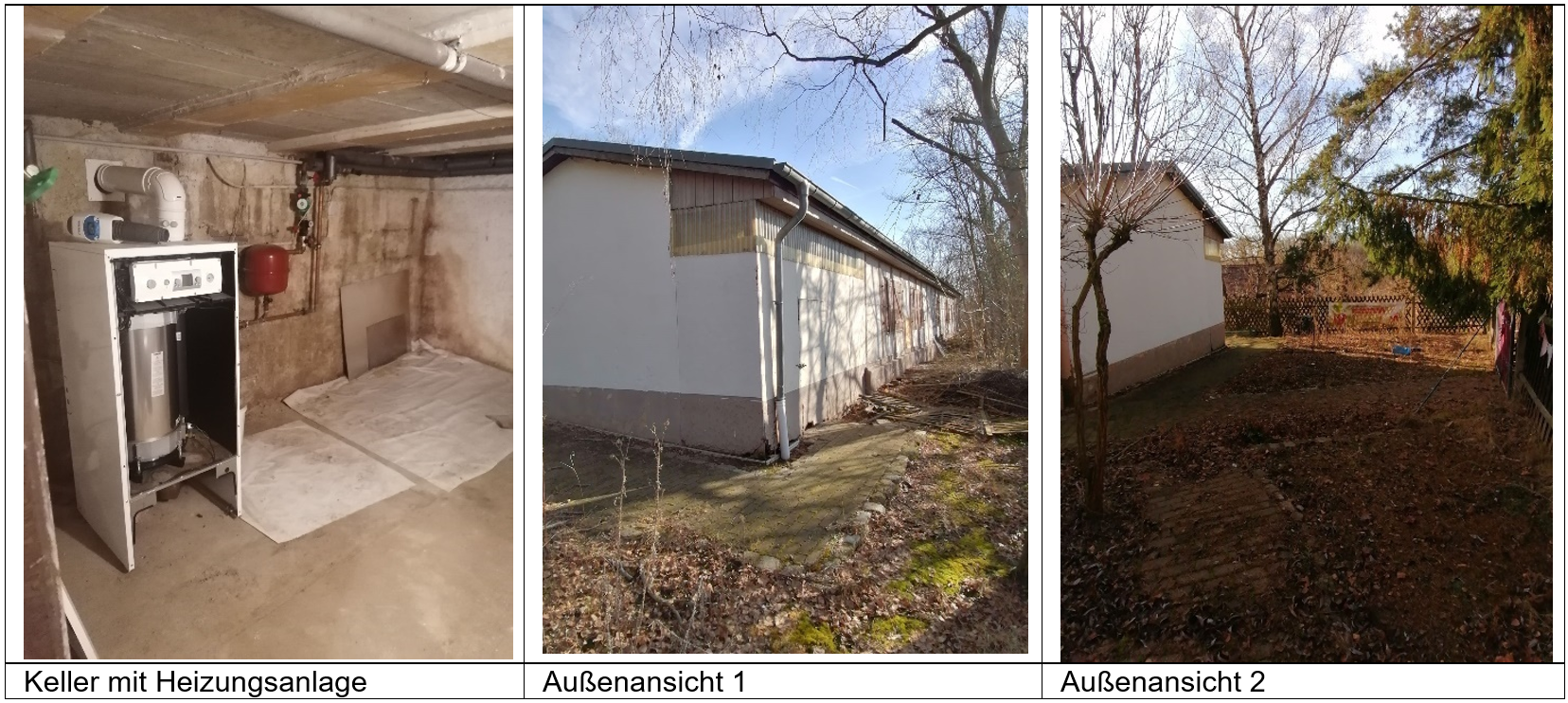Bauweise: Skelett-/ Fertigteilbauweise; Fundament: Streifenfundamente aus Beton; Keller: teilweise unterkellert mit Ziegelsteintreppe (hier befindet sich die Ölzentralheizung); Kellerwände: Ziegelmauerwerk; Außen-/ Innenwände: Fertigteile nicht gedämmt; Geschossdecken: KG Stahlträgerkonstruktion EG Holzbalkenkonstruktion; Dachform: Sattel-/Flachdach mit Bitumenschweißbahnen; Fenster: Holzfenster mit Isolierverglasung; Hauseingang: Tür aus Holz als Blendrahmen ohne Lichtausschnitt; Innentüren: Füllungstüren als Futtertüren in Holzoptik; Fußböden: Laminat, Fliesen und PVC-Beläge; Decken: Gipskarton gestrichen, Tapete, Kassettendecke; Warmwasserversorgung: über Heizungsanlage (derzeit defekt); öffentliche Zufahrt: betoniert; Einfriedung: vorhanden, hinter Gebäude tlw. fehlend