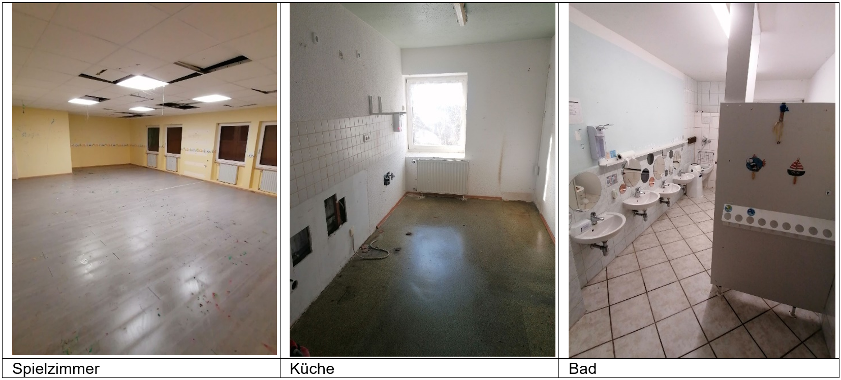 Die Kindertagesstätte befindet sich in einem einfachen bis durchschnittlichen Bau- und Erhaltungszustand und wurde dem Zweck entsprechend instand gehalten. Das Objekt steht seit August 2025 leer. Für eine künftige und zeitgemäße Nutzung zu Wohnzwecken müssten im Gebäude die Grundrisse komplett umgestaltet werden. Damit zusammenhängend muss der Innenausbau, die Sanitärbereiche, die Ölzentralheizung und sämtliche Leitungssysteme modernisiert bzw. erneuert werden. In der Wertermittlung wird dazu ein durchschnittlich modernisiertes Gebäude unterstellt und der Werteinfluss der erforderlichen Modernisierungskosten berücksichtigt.